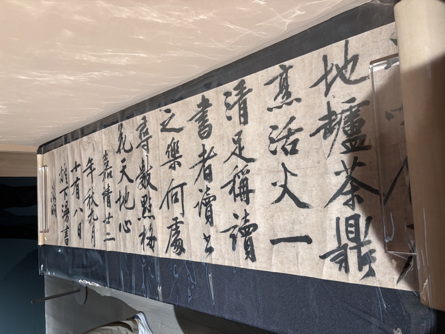 此外,张大千1968年于巴西创作的泼彩作品《春山积翠》吸引观众驻足。“上世纪五十年代,张大千因身体原因,从工笔转向小写意,并尝试将中国传统泼墨与西方水彩融合,逐步发展出‘泼彩’技法。《春山积翠》采用日本定制仿宋罗纹宣纸,以大面积石青、石绿堆叠,呈现水的流动感、山石的复杂与云雾缭绕之景,传统与现代结合,抽象中见具象。”
