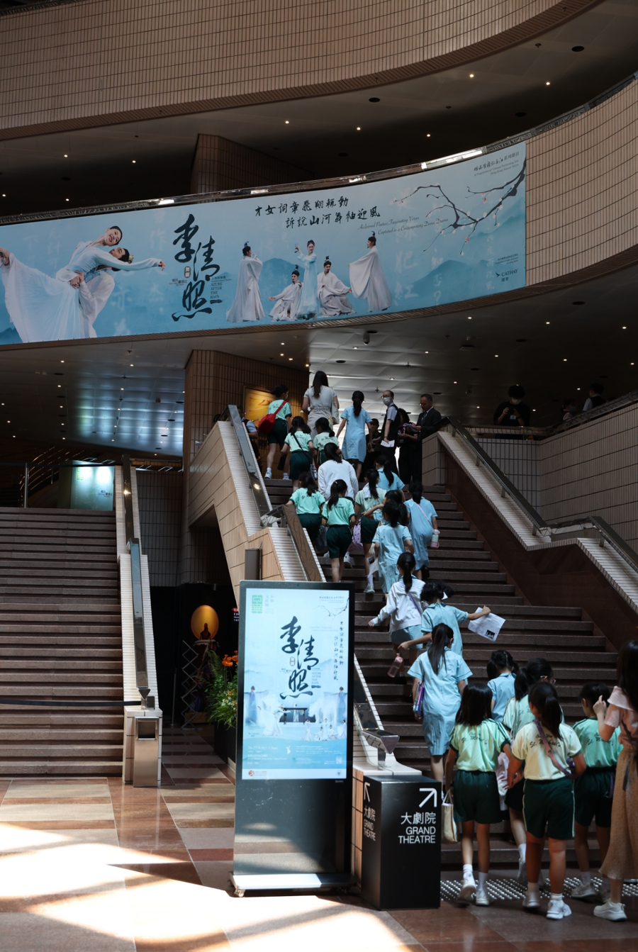 今晚演出前,舞剧《李清照》举行公开联排,来自香港14所中小学生数百名学生成为首批观众。从“争渡,争渡,惊起一滩鸥鹭”的《如梦令》到“物是人非事事休”的《武陵春》,再到“怎一个愁字了得”的《声声慢》,小观众在舞剧公开课中解读李清照的一生,也感知中国传统诗词的无穷魅力。